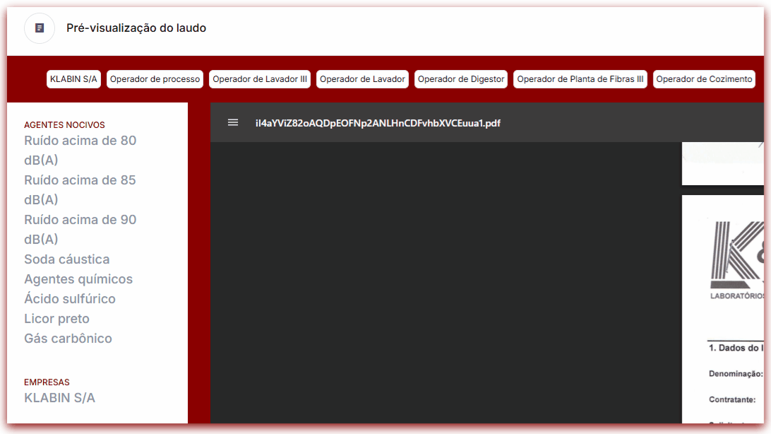 Observe as informações técnicas: No lado esquerdo da janela de pré-visualização, você encontrará tags com as atividades do laudo, empresas relacionadas e os agentes nocivos identificados no documento;