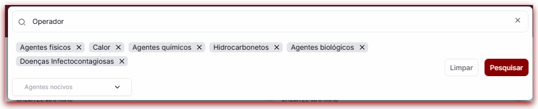 Adicione filtros de agentes nocivos: No campo "Agentes nocivos", digite o nome do agente que deseja filtrar ou busque pela lista;