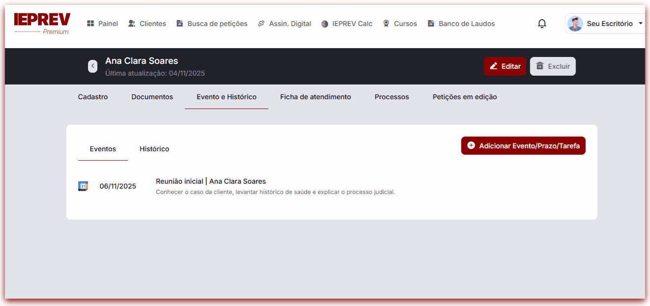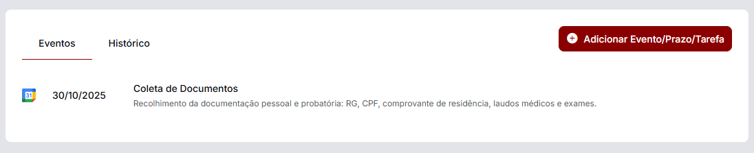 Na aba “Eventos”, clique em “Adicionar Evento/Prazo/Tarefa”: Essa opção permite criar um novo registro de compromisso vinculado ao cliente selecionado.