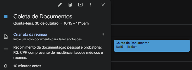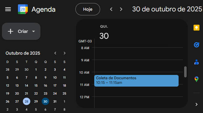 O evento será criado automaticamente no Google Agenda, e você poderá visualizá-lo tanto na plataforma quanto em seu calendário Google sincronizado.