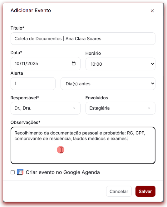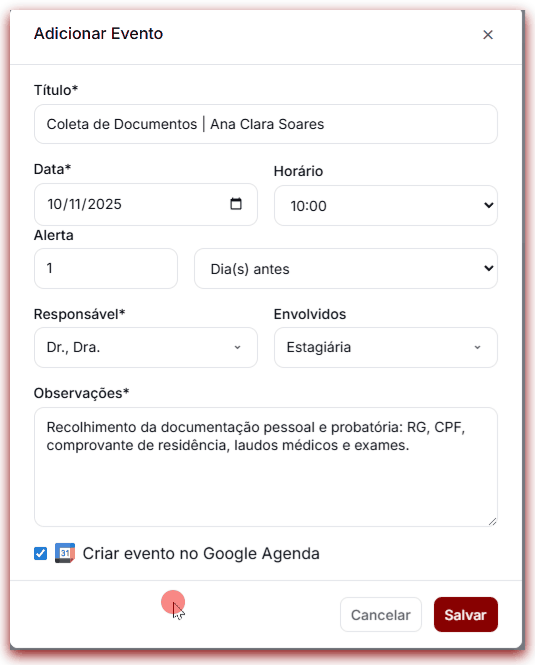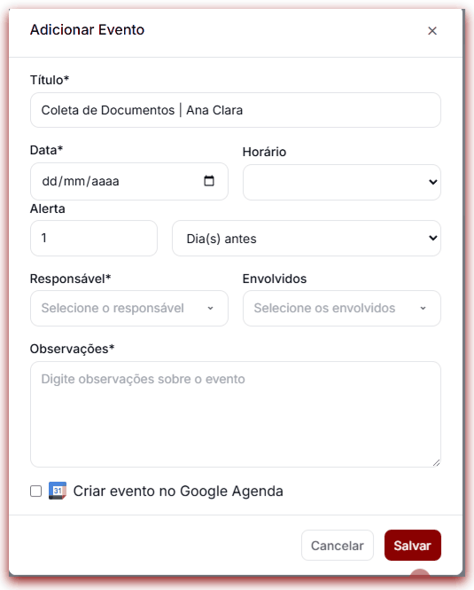 Acesse o cadastro do cliente relacionado > Clique em “Evento e Histórico” > Na aba Eventos, clique em “Adicionar Evento/Prazo/Tarefa” > Preencha as informações > Marque a opção “Criar evento no Google Agenda” > Clique em “Salvar”