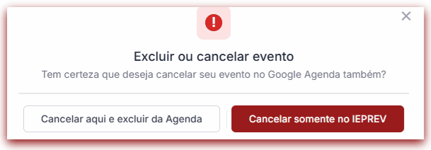 - Cancelar somente no IEPREV: remove apenas do calendário interno, mantendo-o no Google Agenda.