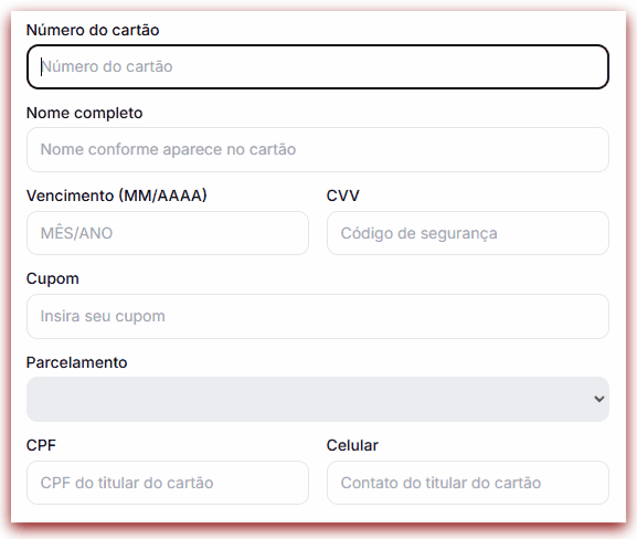 Importante: os juros no parcelamento são definidos pela plataforma de pagamento, conforme a bandeira do cartão, e serão exibidos após a digitação dos primeiros dígitos.